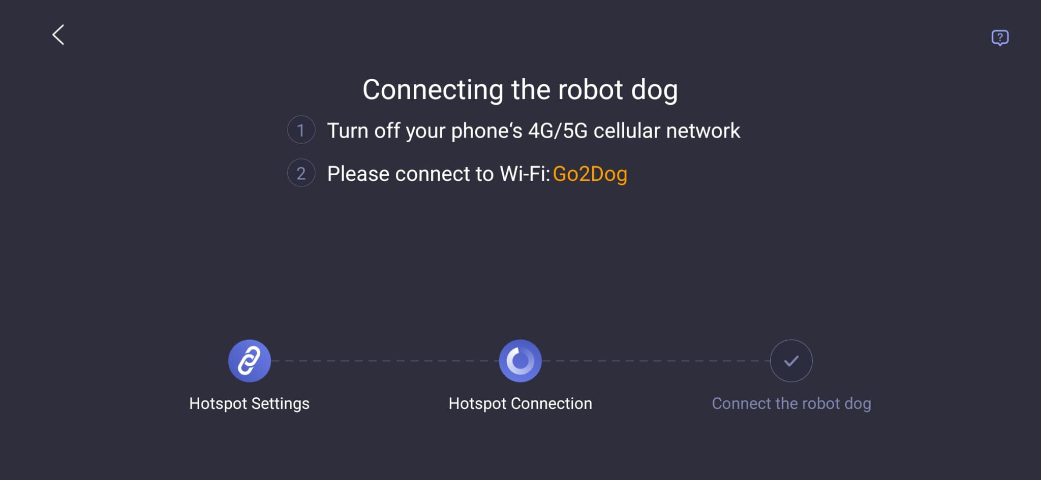 Whenever I try to bind the robot in the app, I only get to the point where one aims to connect to the robot dog. It asks me first if I want to connect to a temporary hotspot, which I can also verify in my Wifi settings (it says connected via the Unitree Go app), but it is stuck at the hotspot connection step and nothing happens: