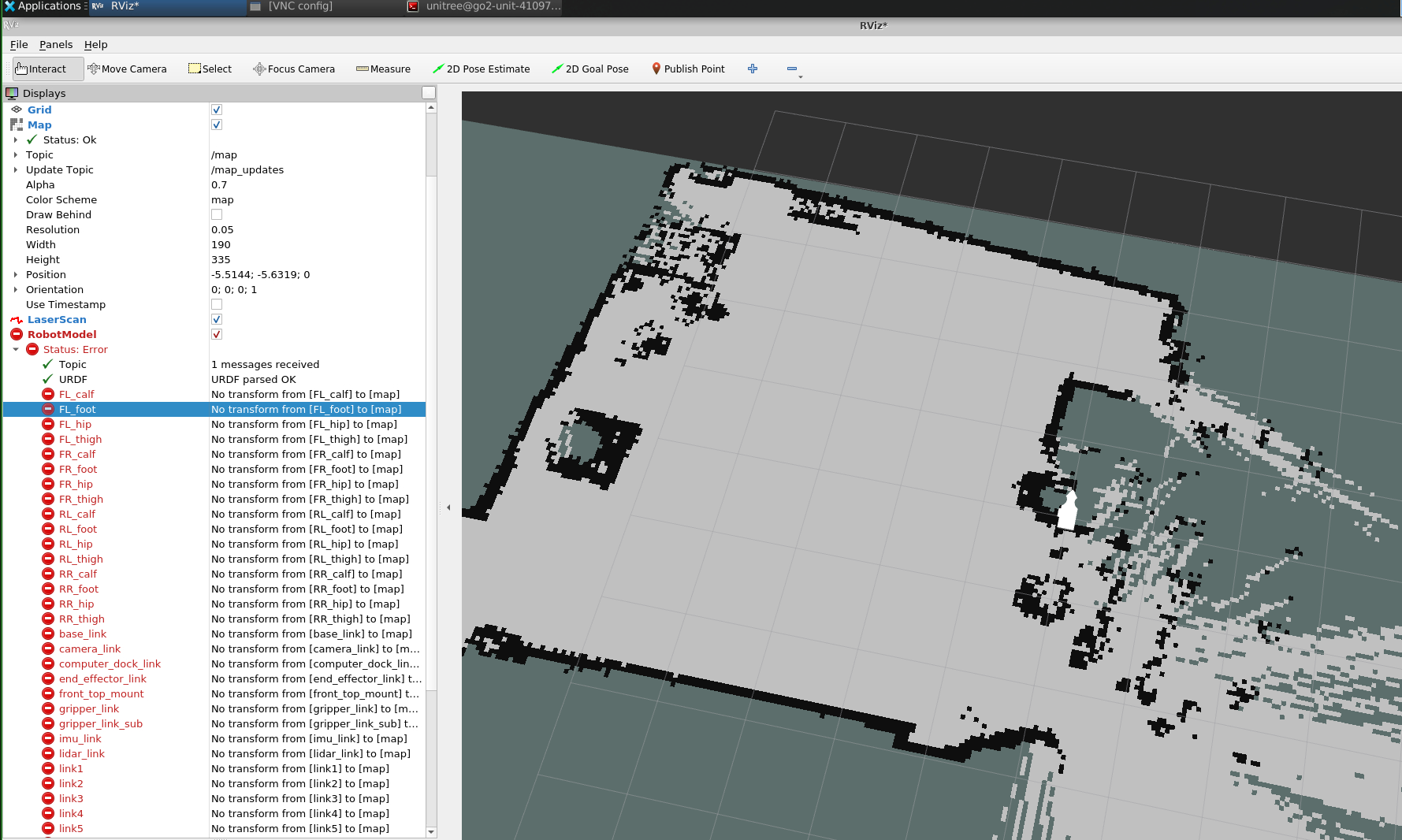 Hi, I got problems while scanning the map and saving it. As can be seen in the screenshot, this is the RViz2 during the map scanning period. The scanned map can be seen while there is error with robot model, as the tf between the robot components and map is missing. So that the position of robot and its components in visualization are not shown.