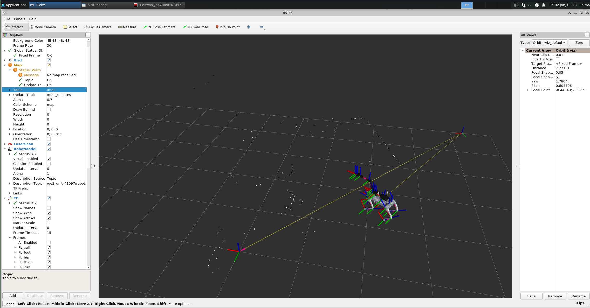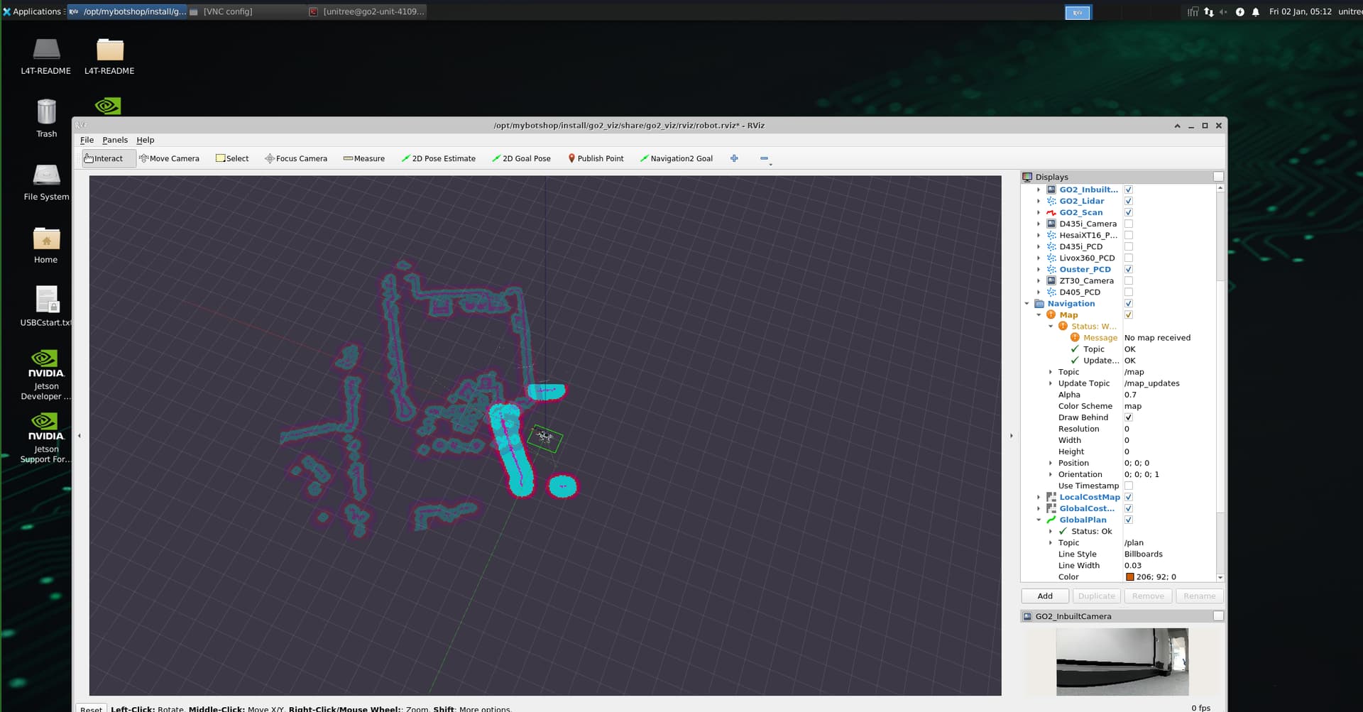 So I started three nodes, one starts the laserscan node(which also enable the robot model to be seen, the tf between robot model and map is given) in go2 platform. The second starts map_navi.launch.py in go2_navigation and the third is a rviz. However the map is not shown in the visualization. How can I be sure the correct map is choosen? As is mentioned in the maual, if the map has been named something other, the parameters needs to be updated. But how and where should it be done? Because I have found nowhere in launch file and param file. Thanks a lot in advance!